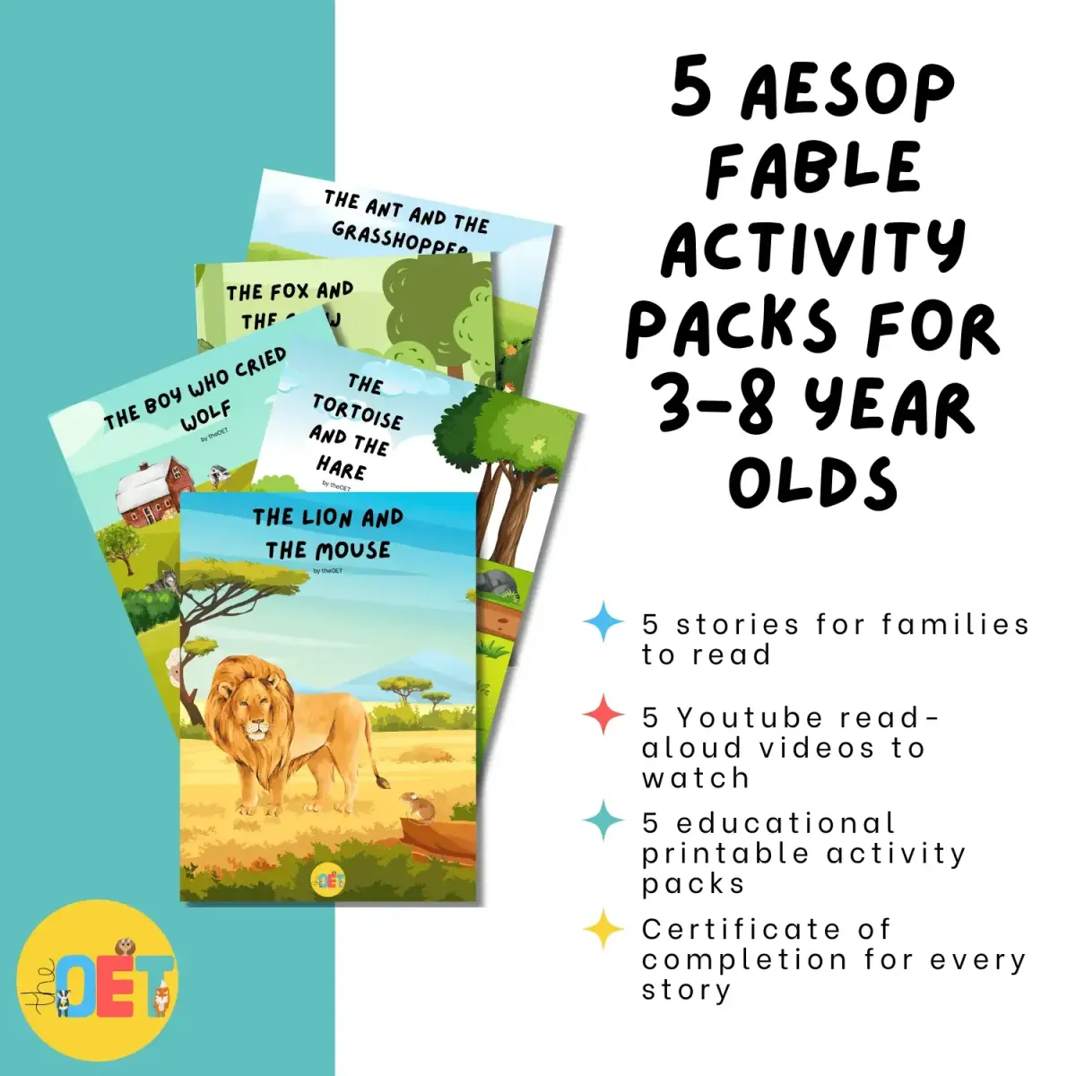 The bundle includes five classic Aesop’s fables: The Lion and the Mouse, The Tortoise and the Hare, The Boy Who Cried Wolf, The Fox and the Crow, and The Ants and the Grasshopper. Each Story & Play Pack contains a PDF download with around 50–60 pages of activities, crafts, games, and worksheets, plus a certificate of completion.